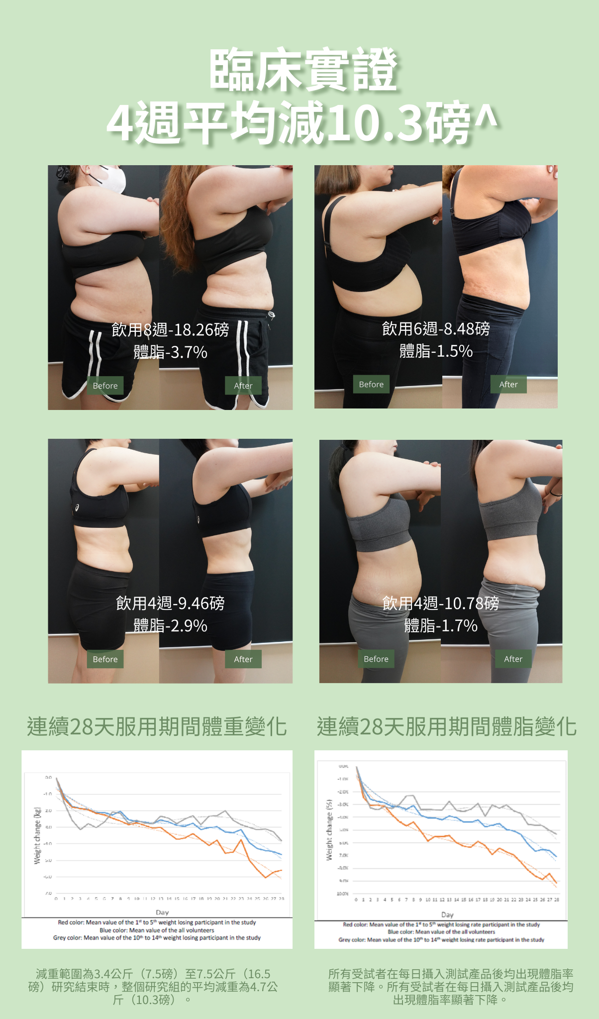 臨床實証,用家飲用產品28天平均減重10.3磅及2.4%體脂